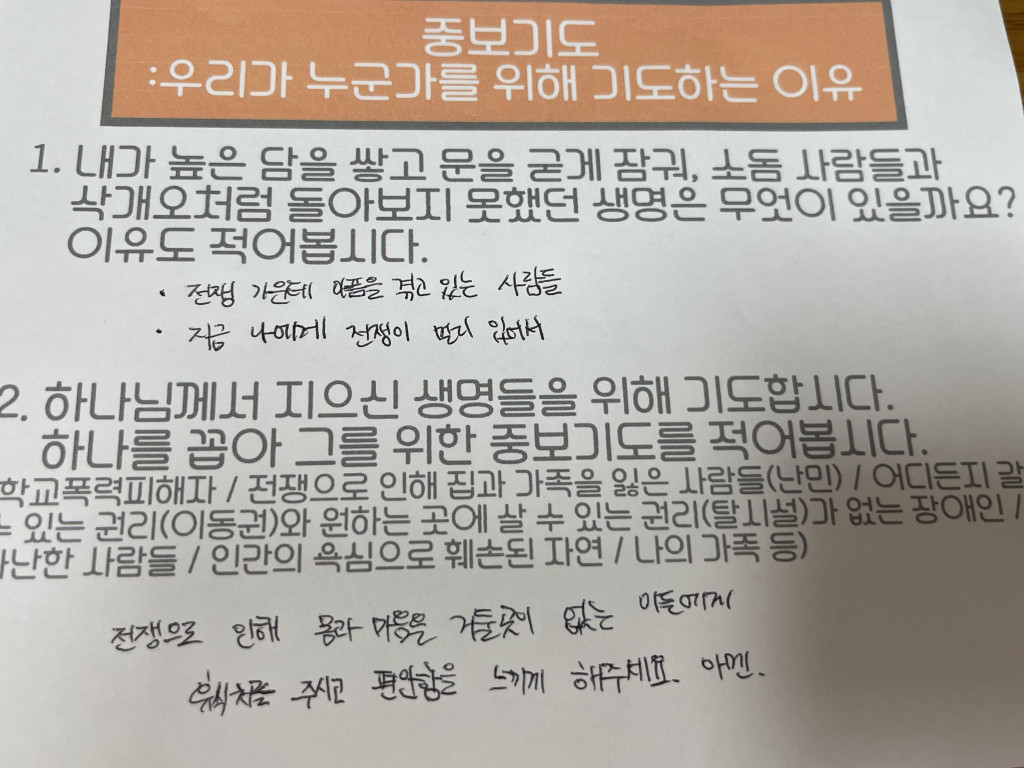 6월 한 달 동안 기도의 의미를 배우고, 중고등부 기도문을 만드는 시간을 가졌습니다.