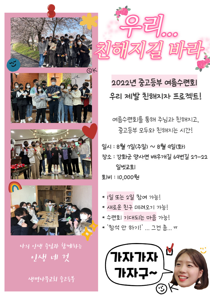 중고등부 여름수련회가 8월 7일(주일) ~ 8월 9일(화) 강화 일벗교회에서 진행됩니다.