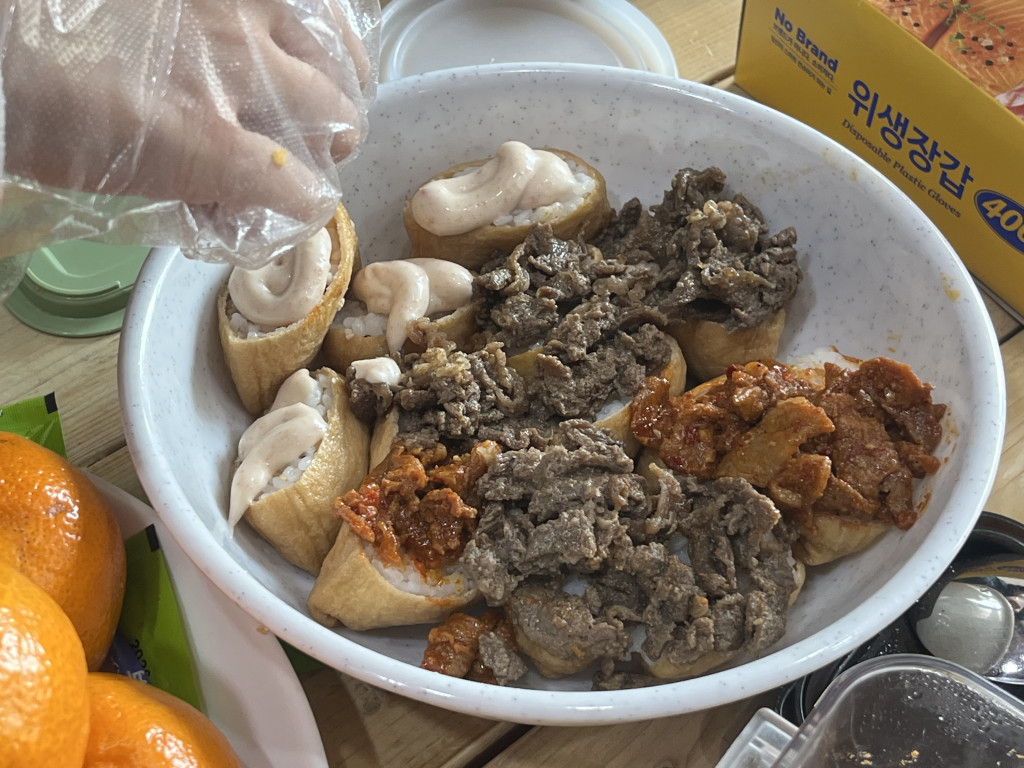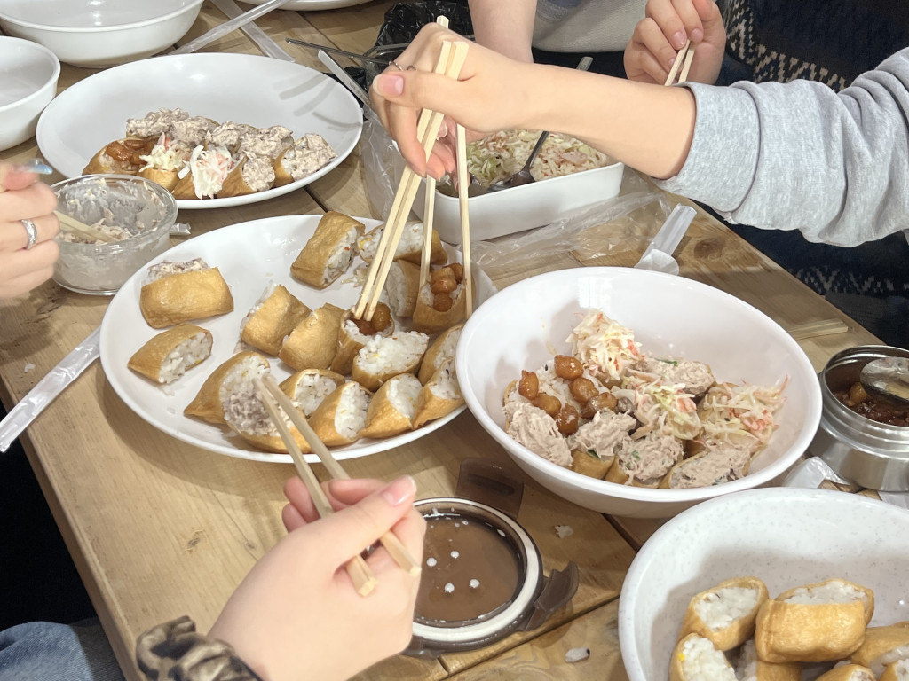 비밀리에 유부토핑을 가져와, 유부초밥을 만들어 모두와 함께 나누어 먹는 시간을 보냈습니다.