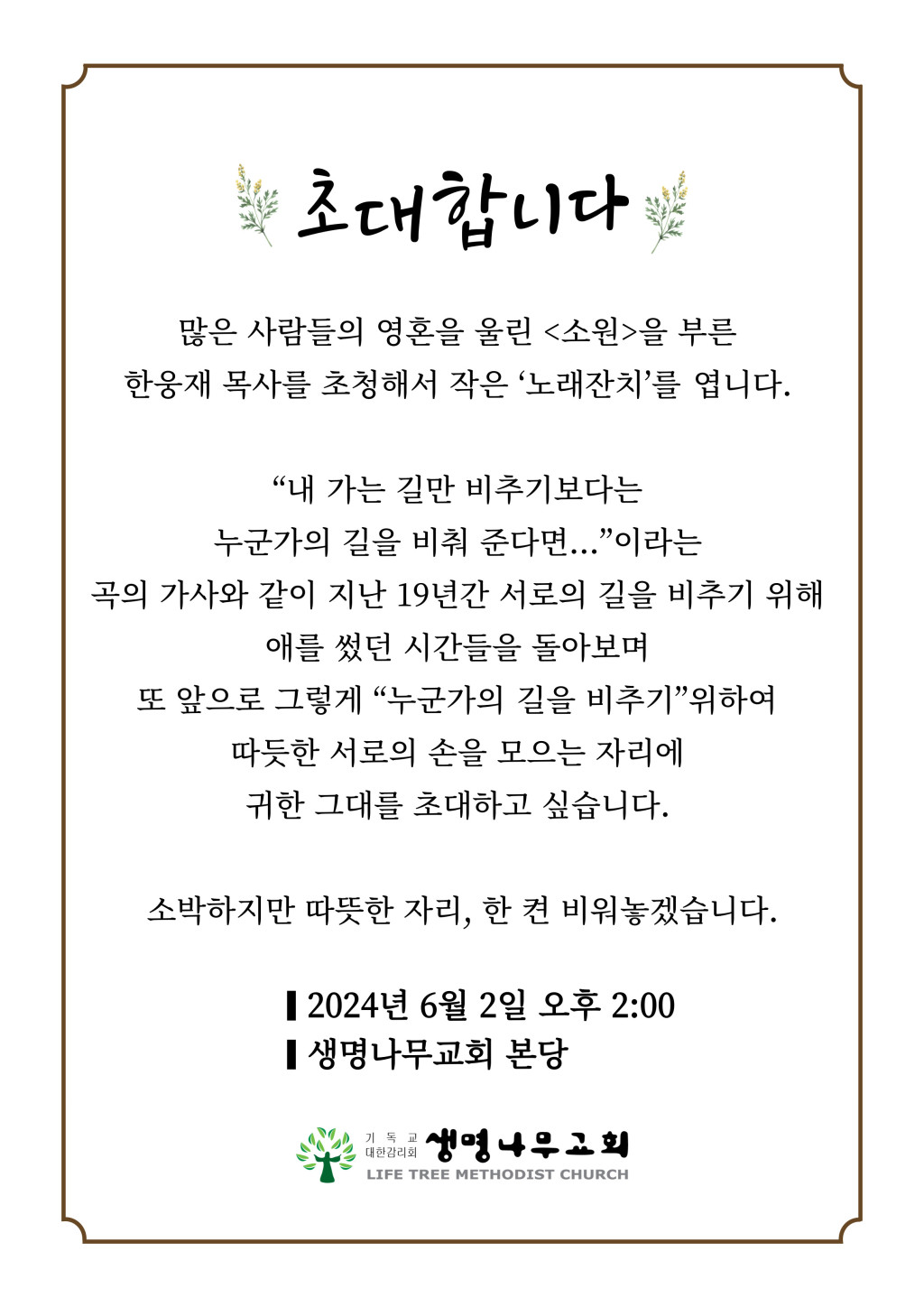 감사하는 마음으로 6월 2일 오후 2시 작은 “노래잔치” 를 계획했습니다.