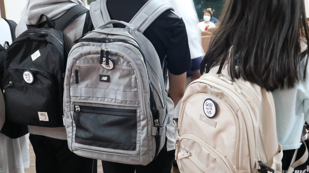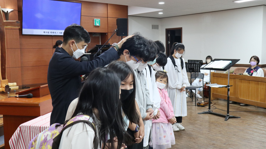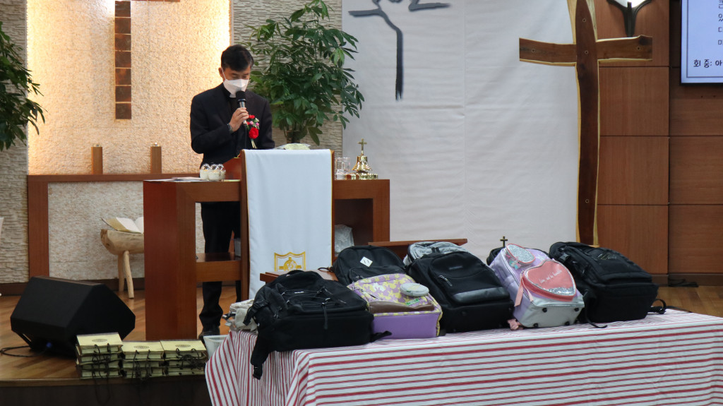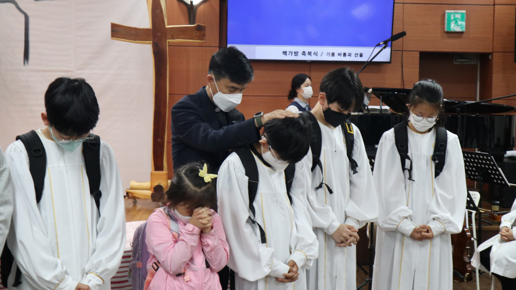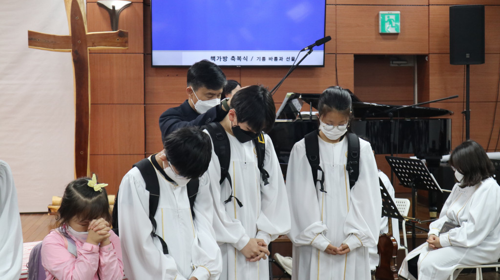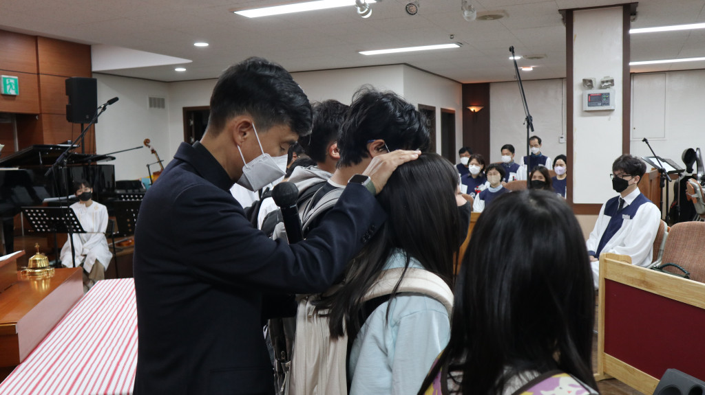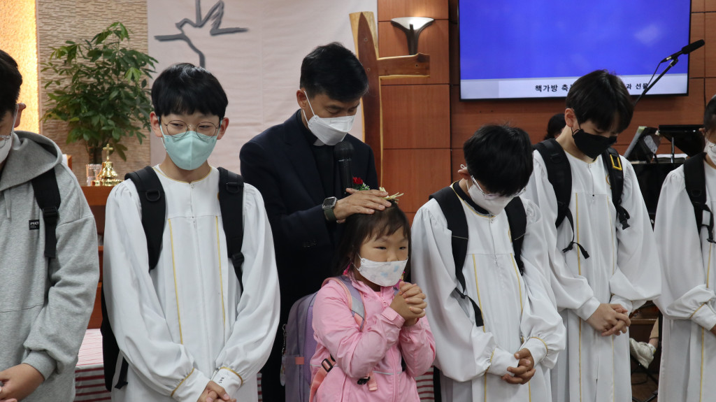 기름을 붓고 축복기도와 언제나 하나님께서 함께하신다는 뱃지를 달아주었습니다.