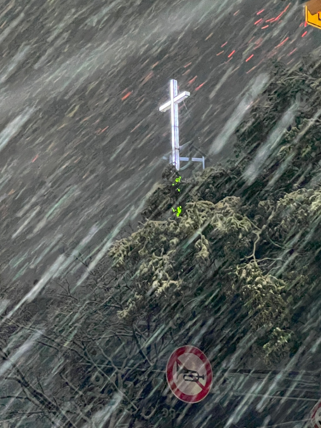 새벽기도 가는 길. 눈에 들어온 눈보라 속의 십자가는 우리가 이 세상의 폭풍의 한 가운데서 어떻게 살아가야 할지를